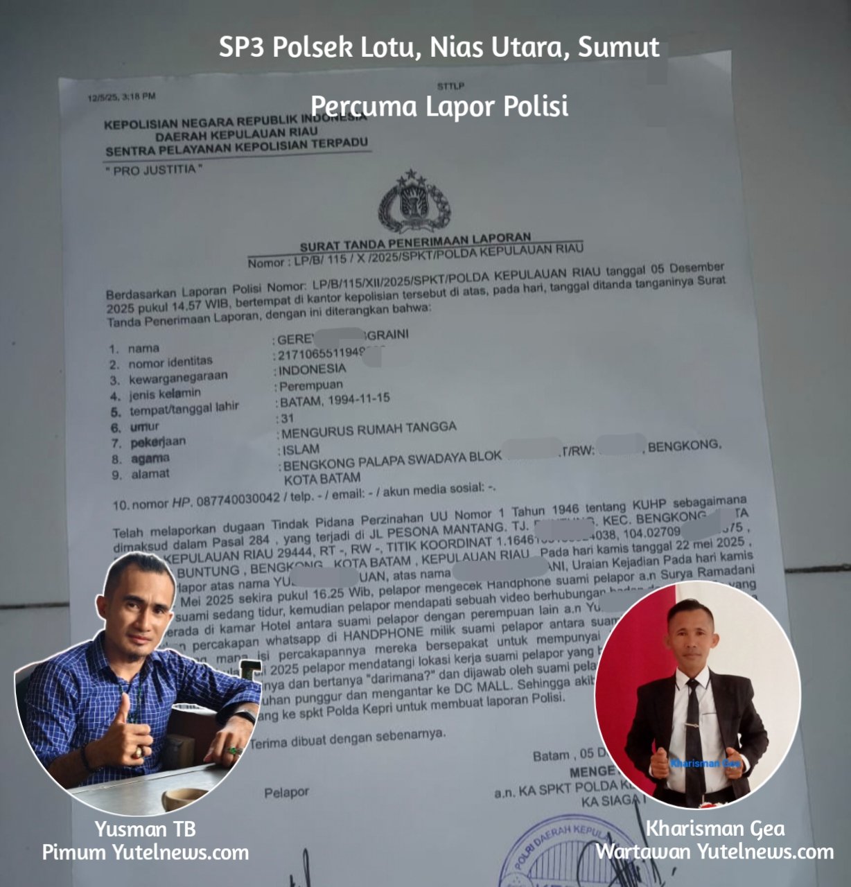 Mitrapol.id – Pentingnya suara hati seorang Jurnalis/Pers di Kepulauan Nias bernama Kharisman Gea (KG) menerima surat Pemberitahuan Penghentian Penyidikan (SP3), Tanggal 30 November 2025, Nomor B/14.d/XI/RES 1.24/2025/Reskrim dari Kapolsek Lotu Nias Polda Sumut Aman Harefa, S.E., MH. Tanggal 05/12/2025.