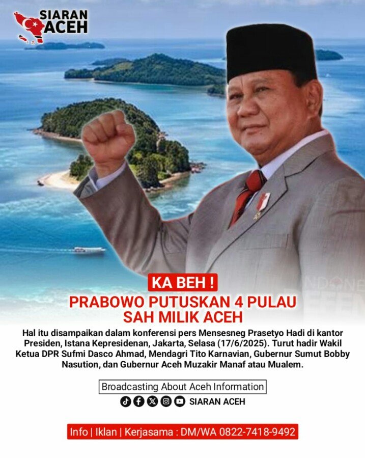 MITRAPOL.id | Banda Aceh – Pimpinan Redaksi Media RajaNews.Xyz Said Yan Rizal, ucap syukur serta apresiasi kepada Presiden-RI Prabowo Subianto yang telah memutuskan empat pulau yang kini disengketakan oleh Provinsi Aceh dan Provinsi Sumatera Utara (Sumut) kembali masuk wilayah Aceh, Selasa (17/06/2025).