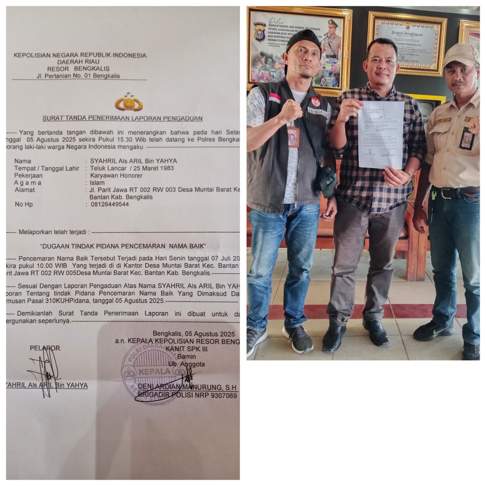 Mitrapol.id : Bengkalis – Sekretaris Desa (Sekdes) Muntai Barat, Kecamatan Bantan, Kabupaten Bengkalis, secara resmi melaporkan seseorang yang diduga telah melakukan pencemaran nama baik dan ujaran kebencian terhadap dirinya. Laporan tersebut disampaikan ke Polres Bengkalis pada Selasa, 5 Agustus 2025.